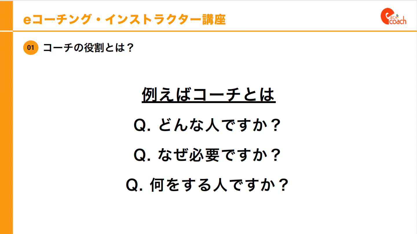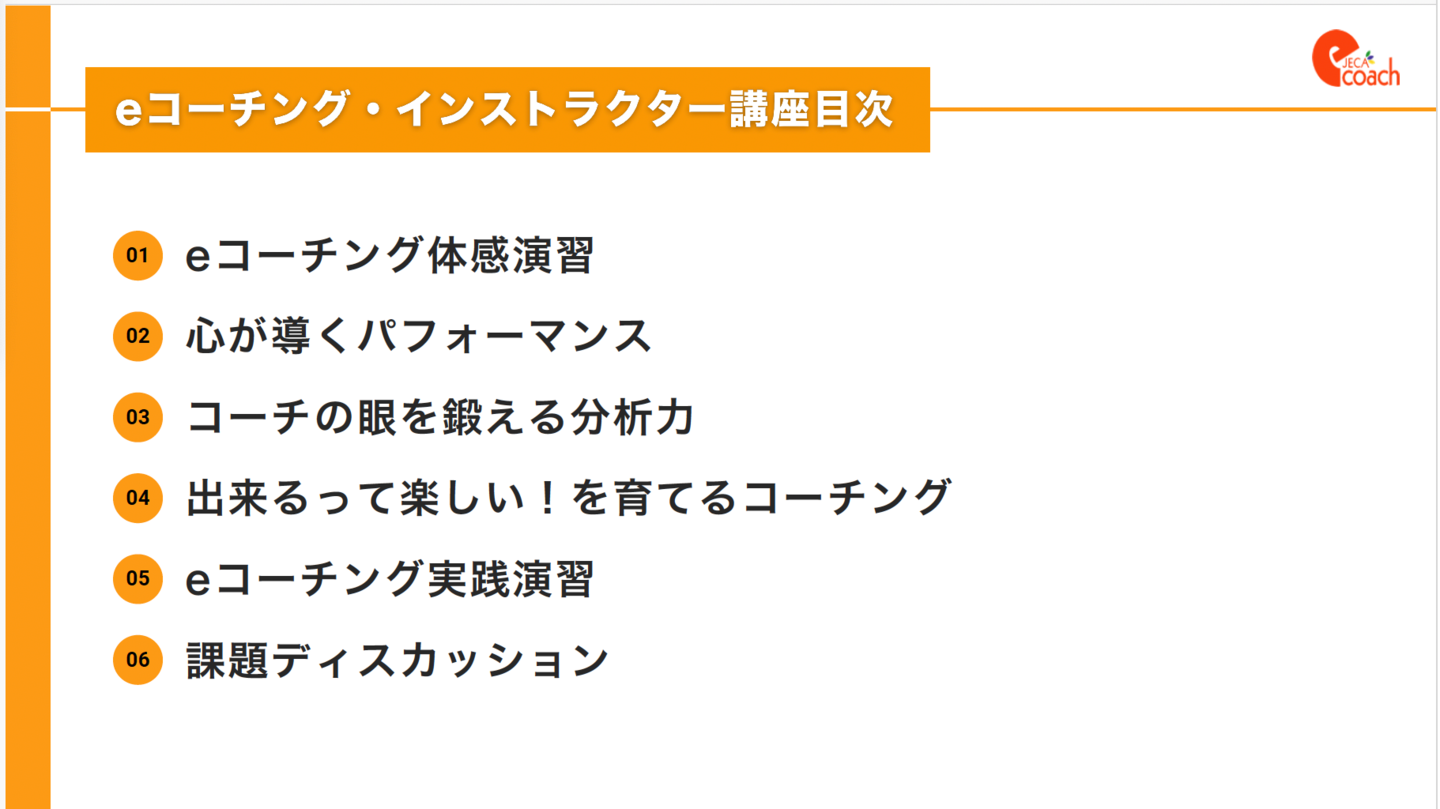 インストラクター講座では、⾃⾝のコーチングの特徴を知り、eコーチングを体験し、コーチングの価値に気づきます。知識の引き出しの多様化とコーチング哲学の探究の⼊り⼝です。